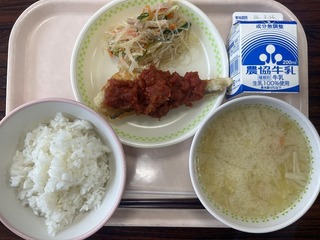 くじらが食卓に上がるのは珍しくなってきましたが、今日のメニューでは、竜田揚げがとても食べやすく、ごはんが進みました。小松菜ののりたくあえは、まろやかな味付けでよい組み合わせでした。
