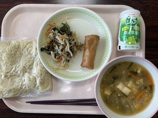 今日の給食のメニューは、「マーボー麺、春巻き、もやしの中華和え、ジョア」でした。マーボーが麺によく絡んでおいしいマーボー麺になりました。