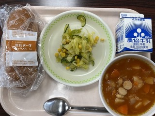 今日の給食のメニューは、「セルフのシャカシャカ揚げパン(キャラメルパウダー)、レモンドレッシングサラダ、じゃがいものトマト煮込み、牛乳」でした。久しぶりの揚げパンは、キャラメルパウダーの甘みがよく合って、食欲が出ました。レモンドレッシングサラダとの組み合わせもよかったです。じゃがいものトマト煮込みは、具だくさんで、身体も温まりました。
