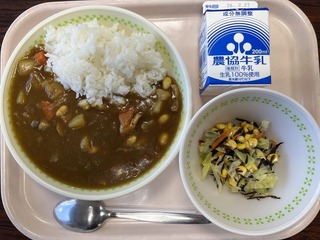 今日の給食のメニューは、「チキンビーンズカレー、ひじきサラダ、牛乳」でした。大豆がたくさん入ったチキンカレーでした。コクがあっておいしかったです。ひじきサラダとの組み合わせもよく、おいしくいただきました。