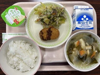 今日の給食のメニューは、「ごはん、メンチカツ、ゆかり和え、わかめの味噌汁、ヨーグルト、牛乳」でした。早いもので、今日が2月最後の給食でした。