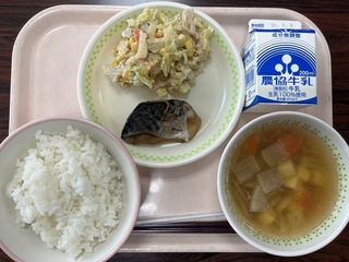 3月になりました。今日の給食のメニューは、「ごはん、鯖のソース煮、レンコンのごまネ~ズサラダ、けんちん汁、牛乳」でした。