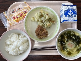 今日の給食は「卒業お祝いメニュー」でした。6年生が家庭科の時間に考えてくれたメニュー「ごはん、鶏肉の唐揚げ、青のりポテト、わかめスープ、みかんクレープ、牛乳」です。