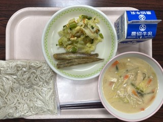「ソフト麺、豆乳キムチスープ、メギスの唐揚げ、アスパラ菜の彩り和え、牛乳」でした。