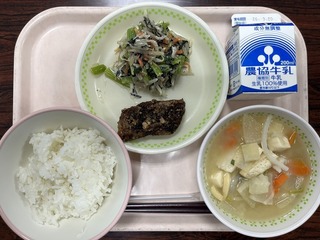 今日の給食のメニューは、「ごはん、厚揚げのごまケチャップソース、ポテトきんぴら、大根と白玉麩の味噌汁、牛乳」でした。厚揚げのソース、ごまケチャップソースは、ごはんとの相性もよく食欲が増しました。ポテトきんぴらは食べやすく、大根と白玉麩の味噌汁はやさしい味付けでおいしかったです。
