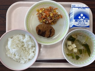 今日から給食が始まりました。メニューは、「ごはん、豆コロッケ、無限人参サラダ、うすくず汁、牛乳」でした。