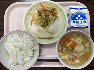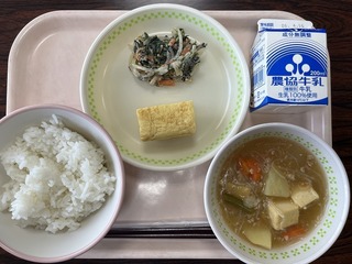 今日の給食のメニューは、「ごはん、だし巻きたまご、磯マヨサラダ、じゃがいものそぼろ煮、牛乳」でした。だし巻きたまごは、ふわっとしていてやわらかく、食べ応えもありました。磯マヨサラダは、なめらかな食感がおいしかったです。