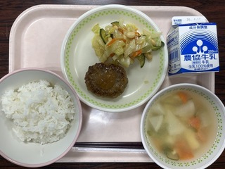 さて、今日の給食のメニューは、「ごはん、ハンバーグのおろしソースがけ、春キャベツと大豆のサラダ、かぶの味噌汁、牛乳」でした。ハンバーグはおろしソースとの相性もよく、ごはんが進みました。春キャベツと大豆のサラダは、色合いもきれいで春を感じるメニューでした。