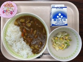 今日は、一年生の入学をお祝いしての「お祝いメニュー」の給食でした。メニューは、「ごはん、チキンカレー、ツナコーンサラダ、お祝いイチゴゼリー、牛乳」でした。