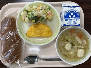 今日の給食のメニューは、「米粉アップルパン、チーズオムレツ、ポテトサラダ、春キャベツと肉団子のスープ、牛乳」でした。アップルパンは、米粉のもっちりした食感とアップルの甘みがよく合って、おいしかったです。今日のオムレツはチーズが入って、風味もよかったです。スープは、具だくさんでおいしいスープでした。
