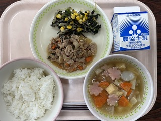 【ふるさとこんだて】今日の給食のメニューは、「ごはん、豚肉の味噌生姜炒め、のり酢和え、お堀の花のっぺい汁、牛乳」でした。