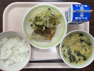 今日の給食のメニューは、「ごはん、白身魚の薬味ソース、つるつるサラダ、中華コーンスープ、牛乳」でした。白身魚は、薬味ソースとの相性がよく、ごはんにもよく合いました。つるつるサラダ、中華コーンスープも食べやすくておいしかったです。