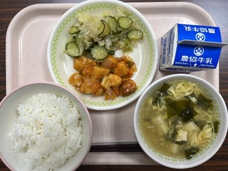 今日の給食のメニューは、「ごはん、ミートボールの酢豚風、ピリ辛漬け、中華た...