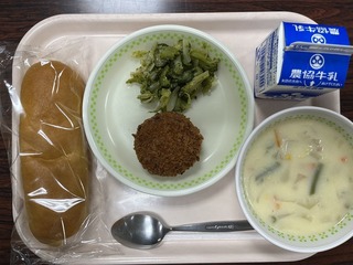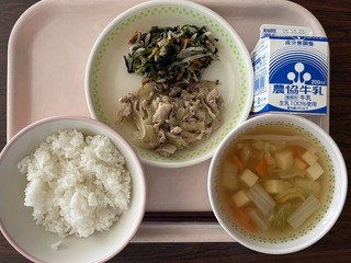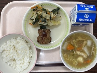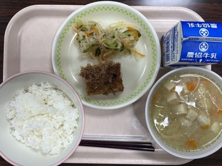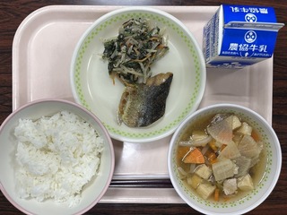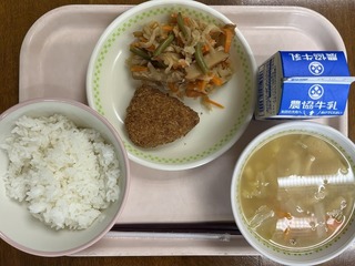 今日の給食のメニューは、「ごはん、だし巻きたまご、キャベツのおかかマヨ和え、サツマイモの豚汁、牛乳」でした。だし巻きたまごは、ふわっとしていてやわらかく、出汁も染みていておいしかったです。キャベツのおかかマヨ和えは、まろやかな味付けでした。サツマイモの豚汁は、体が温まりました。