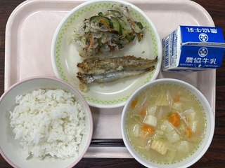 今日の給食のメニューは、「ごはん、ししゃものカレー焼き、かわりきんぴら、キ...