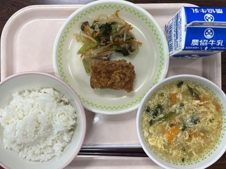 今日の給食のメニューは、「ごはん、魚の磯パン粉焼き、小松菜のガーリックソテー、かき玉スープ、牛乳」でした。魚の磯パン粉焼きは、魚の身も柔らかくて、食べやすかったです。