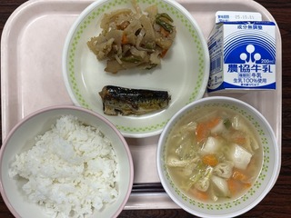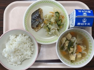 今日の給食のメニューは、「ごはん、鯖の生姜煮、切り干しサラダ、塩ちゃんこ汁...
