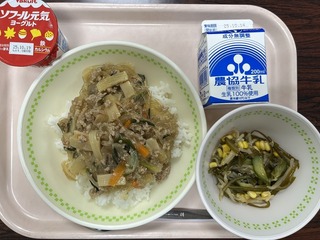 今日の給食のメニューは、「麻婆春雨丼、茎わかめのサラダ、ヨーグルト、牛乳」...
