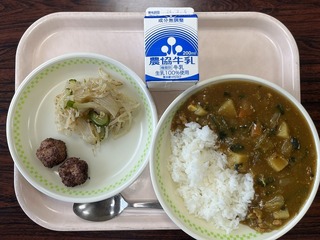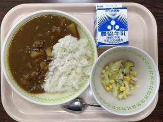 今日の給食のメニューは、「ごはん、秋味カレー、青大豆サラダ、牛乳」でした。...