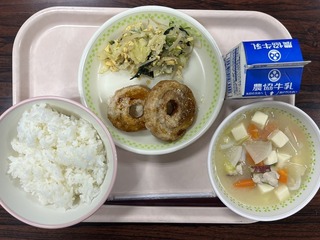 今日の給食のメニューは、「ごはん、イカのさらさ揚げ、秋おひたし、かき玉汁、...