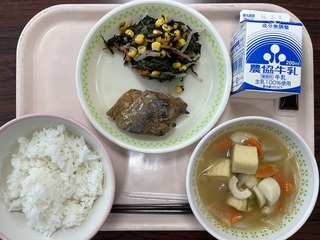 今日の給食のメニューは、「ごはん、シイラのカレー焼き、磯マヨ和え、五目汁、...