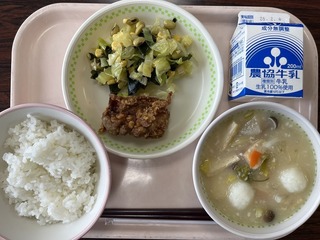 今日の給食のメニューは、「ごはん、厚揚げの肉味噌あんかけ、無限キャベツ、わ...