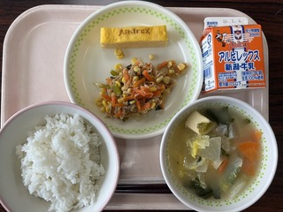 今日の給食のメニューは、「ごはん、厚焼きたまごの枝豆あんかけ、キャベツの味...