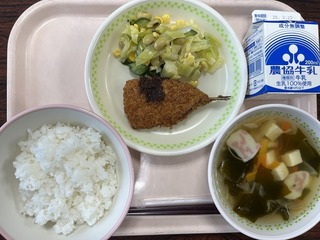 今日の給食のメニューは、「ごはん、鯵のカレーマリネ、枝豆のサラダ、豆腐の味...