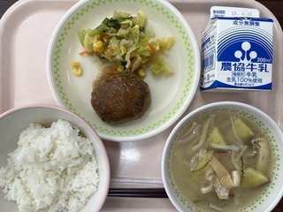 今日の給食のメニューは、「ごはん、ハンバーグのおろしソースかけ、小松菜のさ...